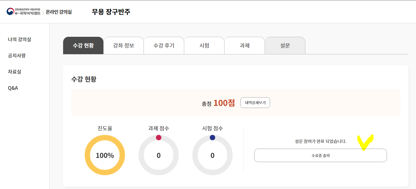 e국악아카데미에서 온라인강좌 학습시 수료처리 맟 수료증 출력 관련하여 기능이 변경되어 알려드립니다